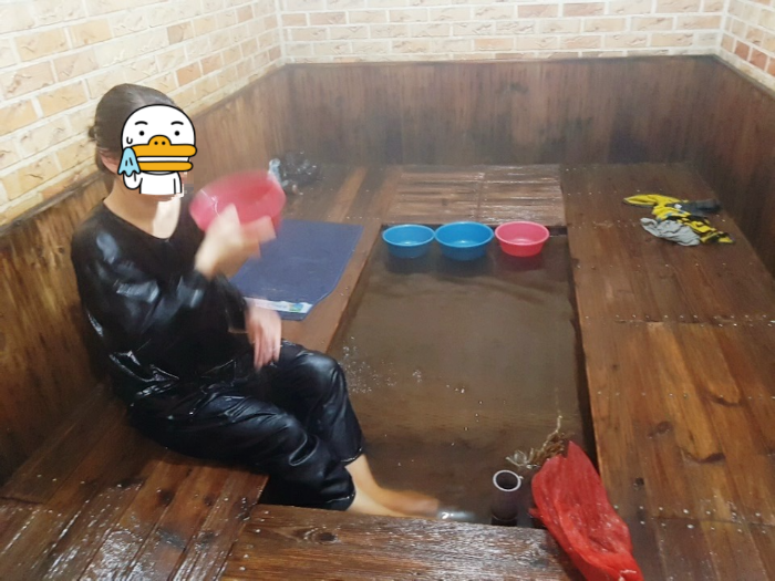 찜질복으로 갈아입고 지정해주시는 방으로 들어가면 아주아주 뜨겁게 데운 유황돌+약초주머니를 욕조에 넣고 바닷물을 끌어다가 채워줍니다. 그러면 물이 펄펄 끓으면서 수증기가 차오름과 동시에 습도가 확 올라오면서 앞사람이 안보일 지경입니다.